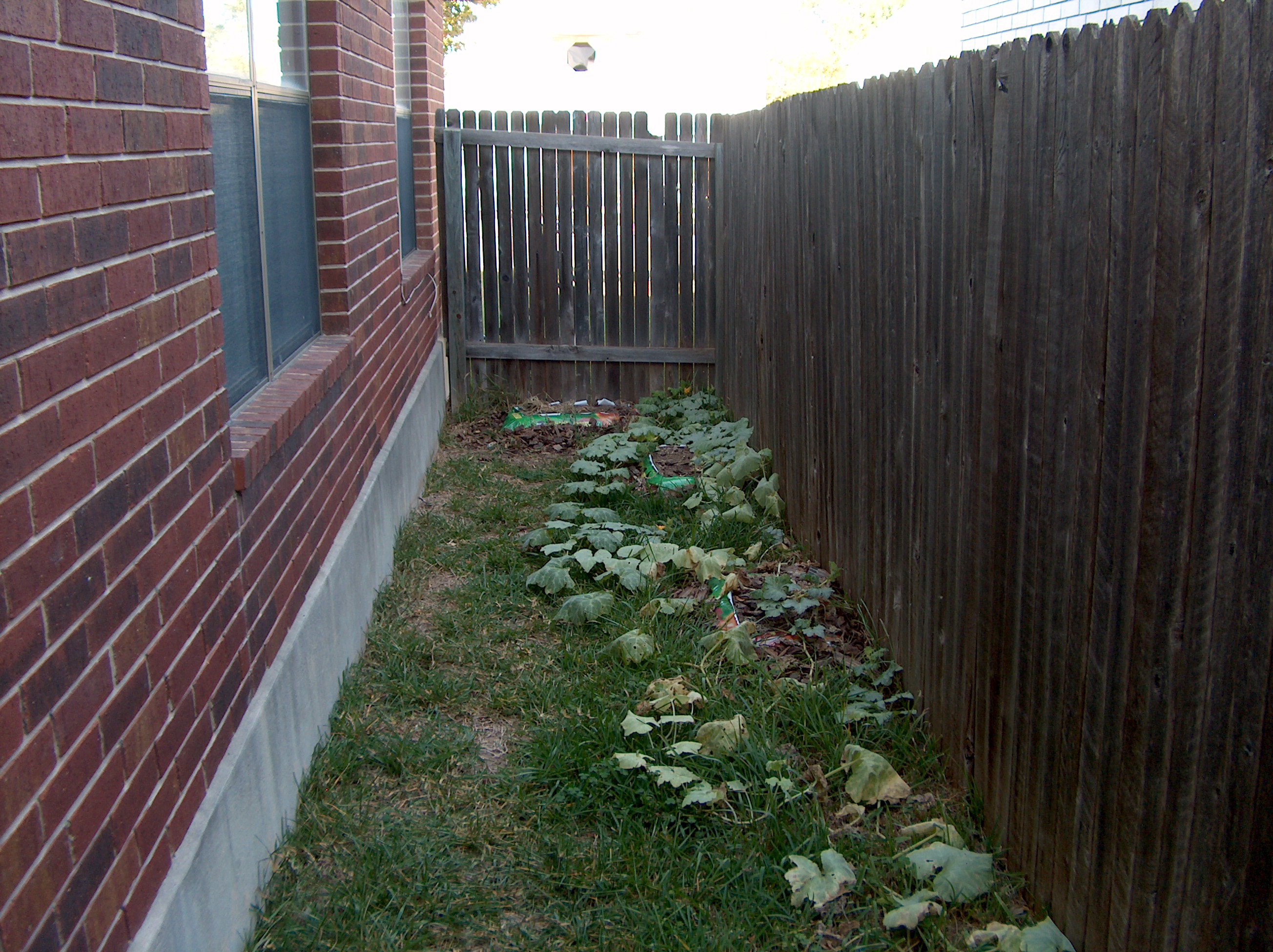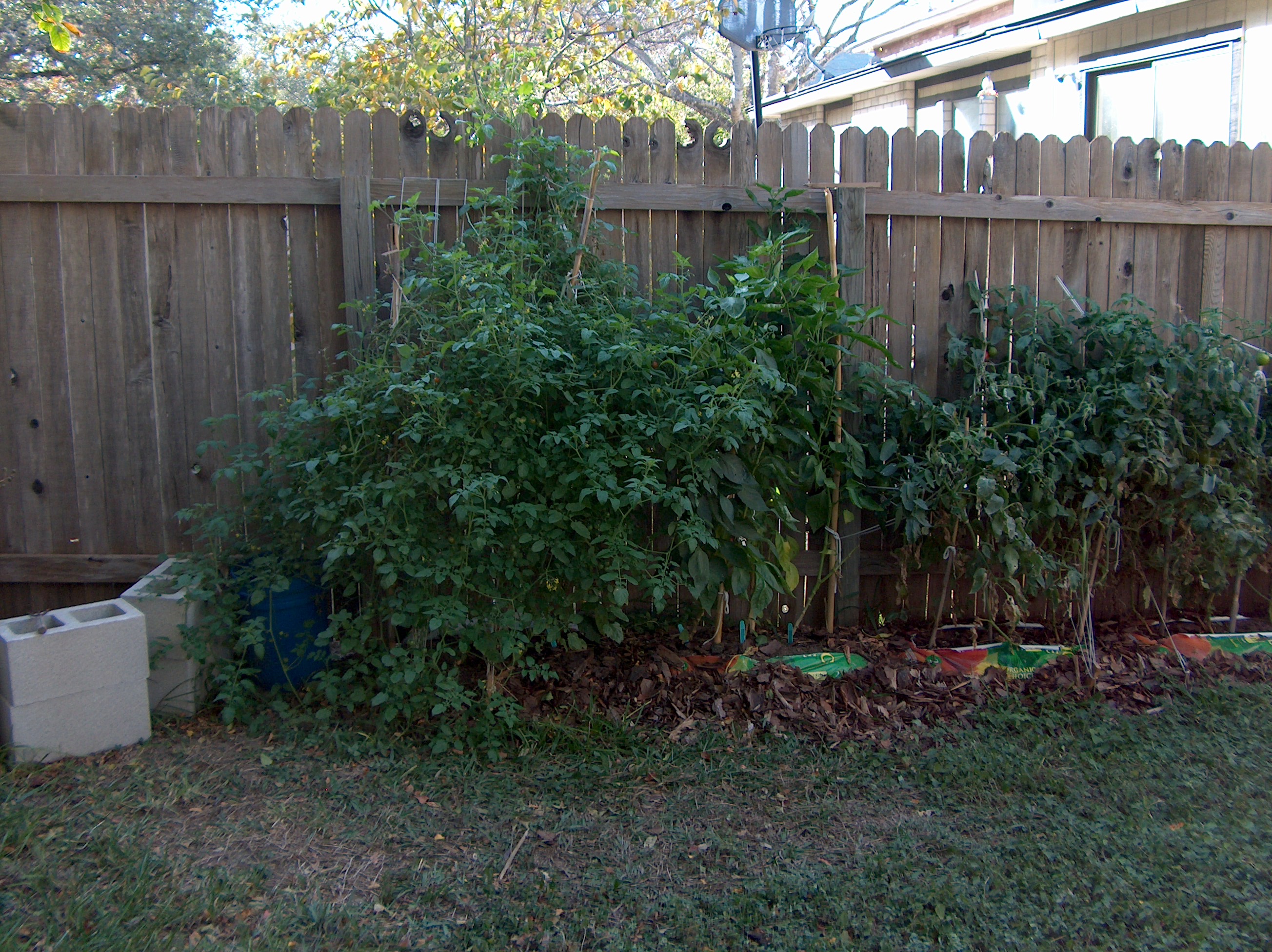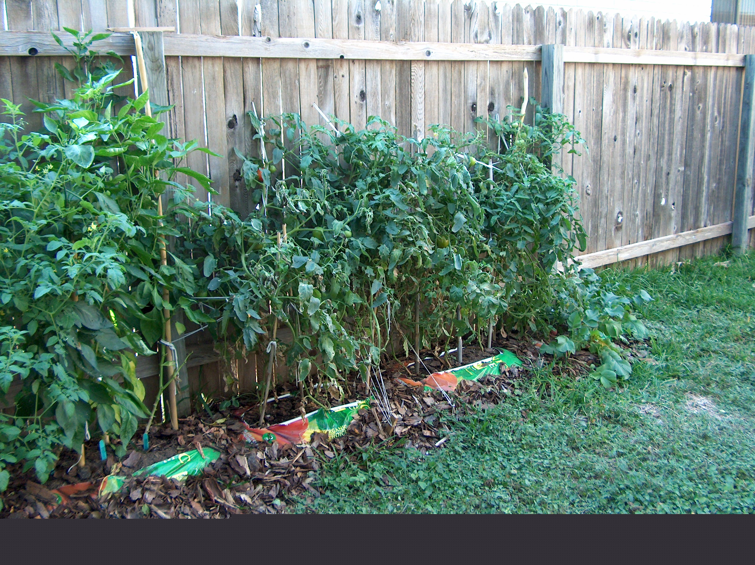 | I'm not going to bore anyone with a long history of my gardens over the years, or of my childhood experiences with gardening. Instead I'll start with something more recent, like last year. For the past few years I have been looking for a piece of property in which to build my dream home, but so far I have not found anything that fits the bill. Therefore I have been leasing a home in San Antonio Texas. The back yard of this home is not very big at all, and it has one very large majestic oak tree right on the fence line. I love having this tree, it provides great shade on the back patio and brings lots of birds and squirrels into the yard. However, shade is not really something a gardener looks for when planting a garden. My yard is small enough to start with, and with the shady area unavailable for planting, sunny areas are pretty scarce. I also mentioned that I was in San Antonio Texas, So in my backyard I have about 4-6 inches of topsoil and then I hit limestone. Not bad for growing cactus, but vegetables usually like a richer deeper soil. My obvious solution was to plant my garden in containers. I have done this in the past with pretty good success, but purchasing containers can get expensive, especially when you are talking about large containers, and then I would need to purchase the potting soil, etc. Spending a lot of money to grow a few vegetables just doesn't make a lot of sense to me, I can always buy organic vegetables at the store, so unless the garden is cost effective, what's the point? Now more then once I have had a small garden in salvaged 5 gallon buckets, and was pretty successful with tomatoes, bell peppers, and jalapenos, but I was really wanting a little more garden then that. I considered building some raised beds. I know of several places where I could get old railroad ties, and I considered using something like this to frame up some beds for planting. Landscape timbers would have worked also, but once again I would have needed to purchase them, and this could get a little expensive. I also considered what my landlord would think about his backyard being framed up with raised beds. When I moved into the house the backyard was pretty barren except for a large cactus planted underneath the big oak tree, other than that the yard was mostly weeds and a little St Augustine grass that was trying too hold on. A small peach tree was planted next too the big oak also, but it is pretty stunted and small living in the shadow of the oak. There was one other tree on the far side of the yard, a fairly large sized Sycamore, but it was almost dead when I moved in. The first season I lived here it put out a few leaves, and then nothing. I had to cut it down shortly after that because of safety reasons. After a lot of consideration, I decided that raised beds would be too much trouble, and I did not think the landlord would approve unless I was willing to tear them down and restore the yard when I moved out in the future, so it looked like my only choice was containers. Then one day I was reading my latest edition of Mother Earth News, and they had an article about "No Dig Gardening". In the article they described how you could use bags of potting soil placed directly on the ground, and plant directly into the bags. This seemed like the perfect solution, so this is how I planted my garden in 2008. Step one, I went on-line and searched for potting soil. I checked all of the major home improvement stores, Walmart, and then called or drove by the garden centers in my area looking for the best price. Potting soil I found out is a little on the pricey side when you are looking at purchasing 12-15 bags. After shopping around, a lot, I finally decided instead of potting soil I would use Garden Soil. I'm going to plant a vegetable garden, so I figured it should work and it was a lot less expensive then potting soil. I also purchased some inexpensive pine bark mulch. In the article they recommended using mulch around the outer edge of the bag for two reasons. One, it makes the garden look nicer because the plastic bags are not visible, and two it helps keep the bags from heating up in the summer heat. According to the article, the proper application to use the bag system is to punch holes in one side of the bag for drainage purposes, and then cut a large square out of the other side for planting. I mowed the yard, then laid out my bags in the sunniest section. I strayed away from the article in one regard however, on some of the bags I didn't cut the entire top off of the bag, I cut four inch circles out for planting. My theory was by only cutting out the circles, the bag would hold more moisture and I would not have to water as often. I guess I should mention at this point that I was trying too create this garden at a bad time of year. With the economy slowing down I decided to take a couple of months off from work and regroup. So here I am trying to start a garden in June and July in Texas. The day time temperatures were getting up in the triple digits on most days, so that's pretty stressful on a garden, and the gardener, but I had the time so I decided to give it a shot. The months of June and July in Texas is not the best time of the year to purchase starter plants at the local garden centers either. Really, the only plants I could find were tomatoes, and even then the selection and the plants were pretty poor. I did find a few descent tomatoes worth purchasing, a regular variety and a cherry variety. For everything else, I purchased seed packets. Once I got the plants home, I put them directly into the bags of soils, and then applied the mulch around the sides and a little on top. Everything looked really great! Now for the seeds. I scrounged around and found some old Tupperware, a couple of lids from some take-out dinners, and some thin cardboard. I cut the cardboard to fit the bottom of my containers, placed them in, and then covered with a thin layer of potting soil. The potting s
