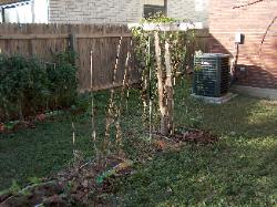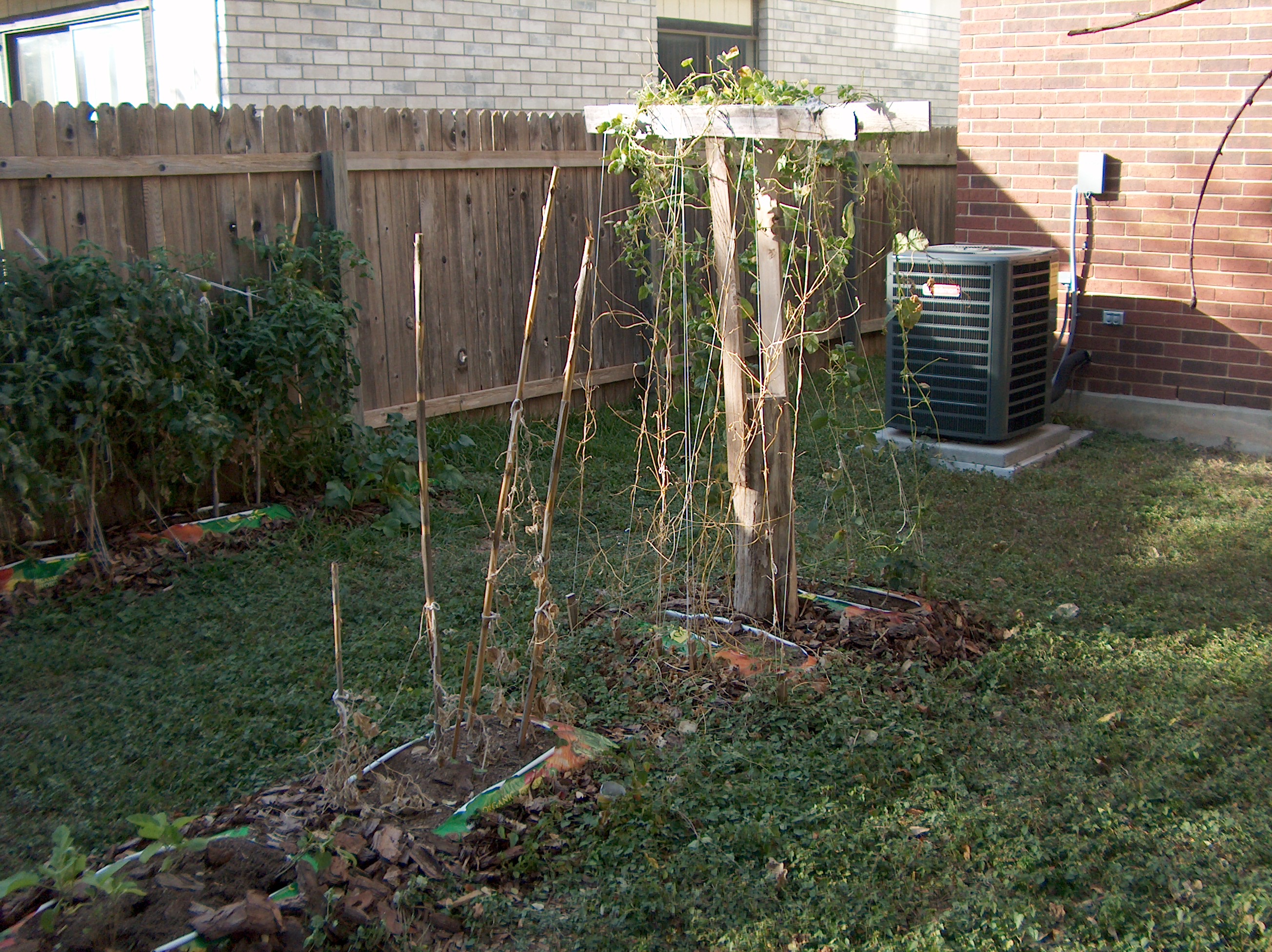 | Click photo to enlarge. Sorry, but this photo was at the end of the growing season so it's not so pretty. Remember the Sycamore tree I cut down? That's the stump in the middle of the photo. I nailed some old fence pickets together and made a support for the beans. I drove stakes in the ground and ran Kite string up to the supports so the beans had something to climb on. On the left you can just see the egg plants, and just to the left of the beans are the cucumbers. It may not look like much now, but I got a pretty good crop of beans during the season, and had so many cucumbers that I taught myself how to make pickles so they wouldn't go to waste. |