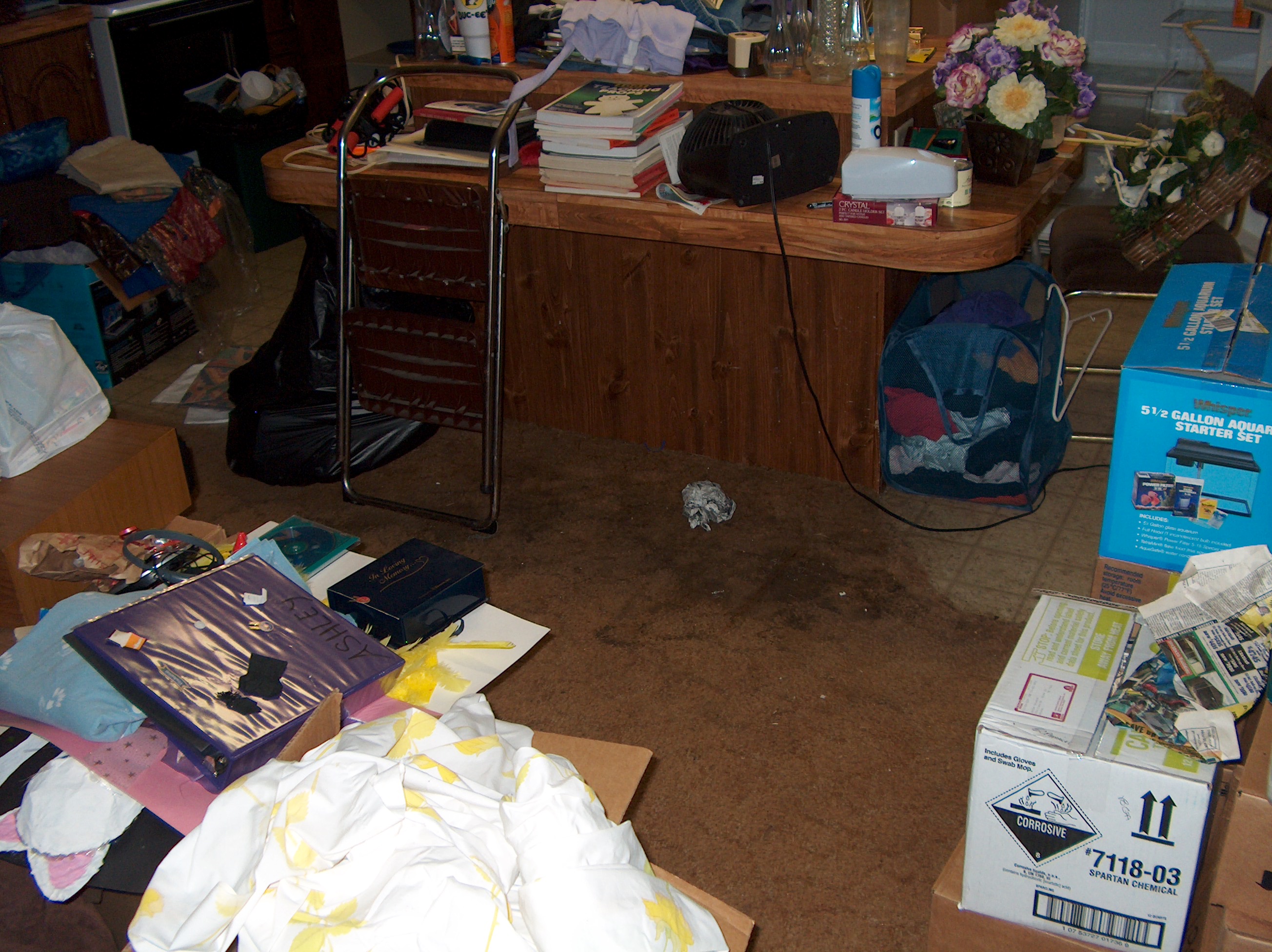 | Beginning scenario: The property has not been occupied as a residence for approximately one year. The most recent past residents did not take care of the place at all, and allowed it to fall into disrepair. The past residents also had numerous pets (dogs and cats) which they kept in the home and allowed to urinate and defecate at will with little if any clean up. After the past residents moved out, they left many of their possessions behind, and the house became a storage facility. In regards to the shop areas. One side of the front shop was being utilized as a leather shop and ammo reloading area. This area was maintained in a working condition, and was still being utilized up until current time. The Left side of the front shop was being used as additional storage space by the previous residents. In the back two story shop, a past resident lived in the apartment area on the second floor and this area was kept clean and maintained. The resident in the apartment also utilized the ground floor of the building as a workshop in which he worked on computers and radio controlled airplanes, so this area too was maintained to some degree. The first step of establishing this homestead is to get the house cleaned up and repaired to a livable state. In it's current condition the house is not fit for human habitation. Below are some pictures of the inside of the house. |