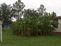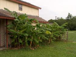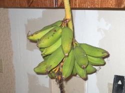 | As you can see from the picture on the left, I am getting a little fruit from the banana trees. I actually harvested two clusters of bananas like the one on the left last year. I learned that if you leave the bananas on the tree, they will not sweeten up and taste like the bananas we know from the grocery store, instead they will stay starchy. The trick is to wait until the fruit has reached it's full size, and then cut off the stock and hang the bananas in a shady area with good ventilation. I hung mine from the rafters of the back porch. When you harvest the bananas like this, the starch in the bananas will convert to sugar as they hang there, and within a short time the bananas become sweet. As for production, I have recently learned that if the banana tree is putting all of it's energy into producing baby trees, it will not produce fruit in most cases. As mentioned above the future plan is to transplant the banana trees into a raised bed, and set up an irrigation system. Once this is done, I will be proactive at removing any small trees that sprout up. I'll remove the small trees from their mother, and transplant them into pots which I will hopefully be able to sell and produce a little income. One important note for those of you who do not know. Once a tree produces a stock of bananas, that particular tree has fulfilled it's life and will die. So you must be careful and not remove all of your baby trees, once production of fruit begins or else you will end up without any trees. |